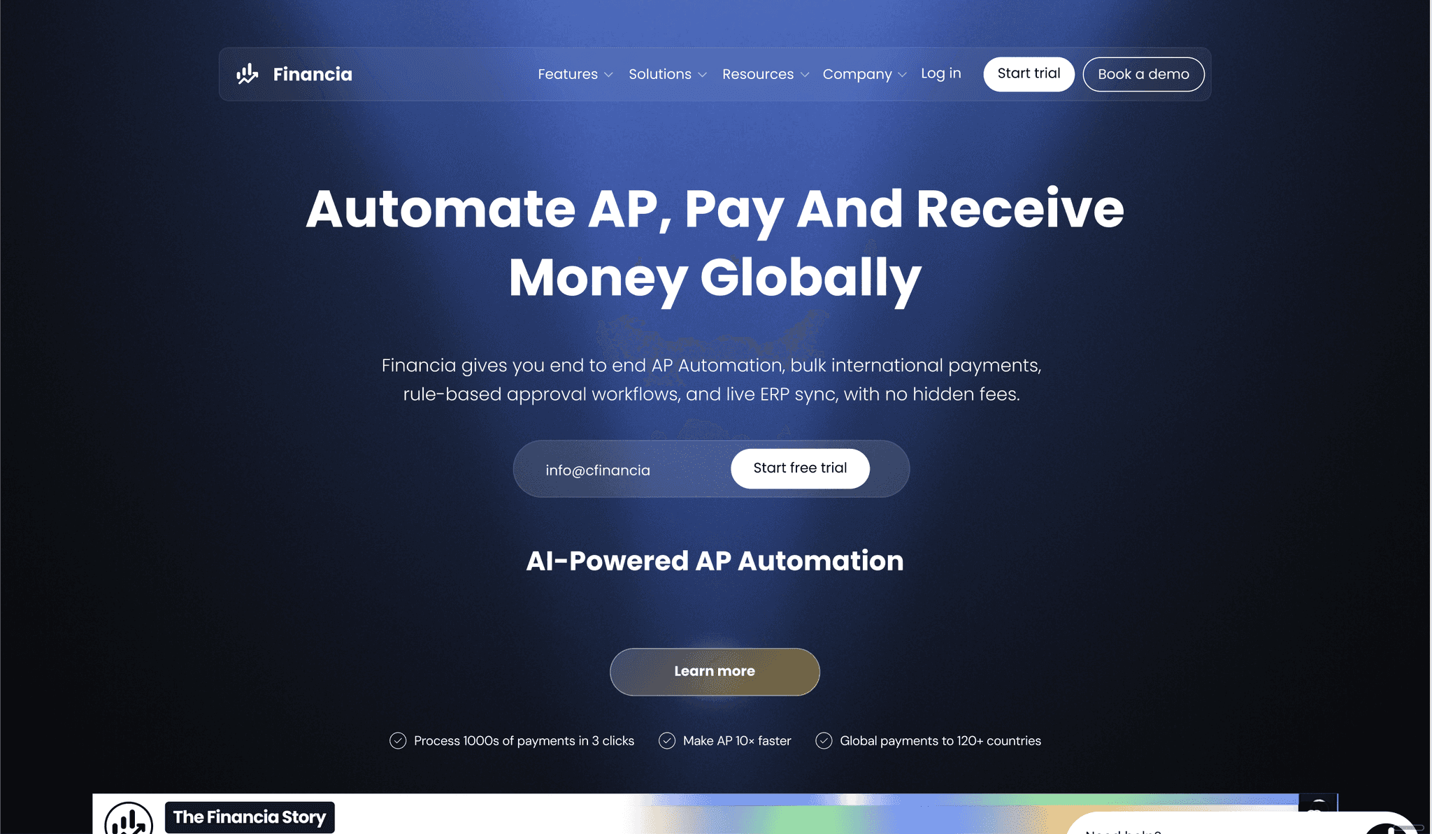 Financia excels where banks disappoint you — automate accounts payable, collect international revenues like a local business, and manage cash across multiple entities.